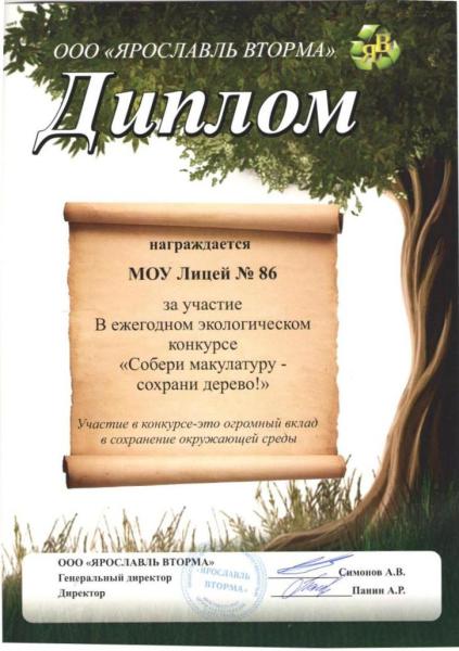 Муниципальное общеобразовательное учреждение "Лицей № 86" награждено Дипломом за участие в ежегодном экологическом конкурсе "Собери макулатуру - сохрани дерево!".