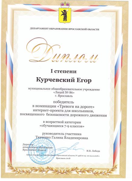 Курчевский Даниил, 7 класс, стал победителем конкурса в номинации "Тревоги на дороге" в возрастной категории "Обучающиеся 7-9 классов". Руководитель Ткаченко Галина Владимировна, учитель информатики муниципального общеобразовательного учреждения "Лицей № 86".