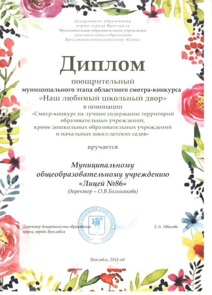 Муниципальное общеобразовательное учреждение "Лицей № 86" награжден поощрительным дипломом муниципального этапа областного смотра-конкурса "Наш любимый школьный двор"в номинации "Смотр-конкурс на лучшее содержание территории образовательных учреждений, кроме дошкольных образовательных учреждений и начальных школ - детских садов".