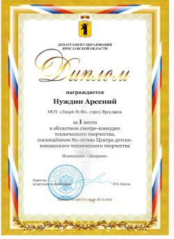 Поздравляем Нуждина Арсения, ученика 10 информационно-технологического класса, одержавшего победу в областном смотре-конкурсе, посвященном 80-летию Центра детско-юношеского технического творчества (номинация "Диорама").